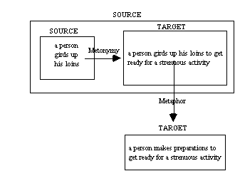 In it the contenders are seen as figuratively getting ready for energetic action by girding their loins. In fact, the act of a person girding his loins metonymically stands for a more general situation in which the person is preparing to do something difficult or dangerous. We may diagram the metaphor-metonymy interaction of the figurative expression gird up one's loins as follows:
